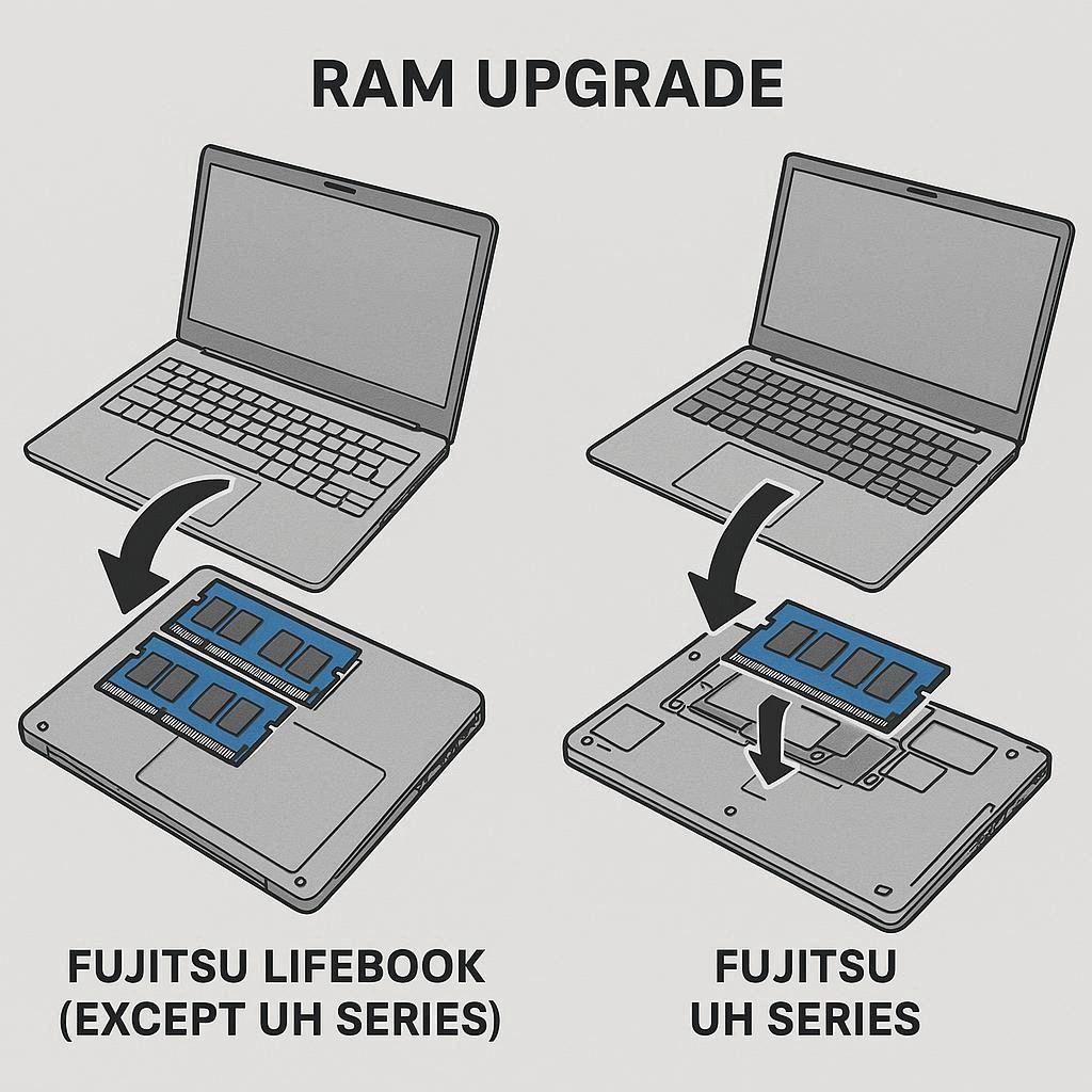 ارتقا رم در لپ تاپهای فوجیتسو به سری دستگاه بستگی دارد و دو سری محبوب Lifebook و UH ویژگیهای متفاوتی دارند که هنگام ارتقا باید به آن توجه کرد. سری Lifebook اغلب مدلهای قدیمی و میانرده را شامل میشود و بیشتر از رم DDR3 با حداکثر ظرفیت ۱۶ گیگابایت پشتیبانی میکند. نصب رم در این سری نسبتا ساده است و اسلاتها در پشت لپ تاپ قرار دارند، بنابراین کاربران معمولی میتوانند با رعایت نکات ایمنی رم را ارتقا دهند. سری UH اما مدلهای سبک و باریک فوجیتسو را شامل میشود و از رم DDR4 یا DDR5 با حداکثر ظرفیت ۳۲ تا ۶۴ گیگابایت پشتیبانی میکند. نصب رم در این سری نیازمند باز کردن کامل قاب و دقت بالا است، زیرا فضای داخلی فشرده و قطعات حساس در نزدیکی اسلاتها قرار دارند. در نتیجه ارتقا رم در سری UH تخصص بیشتری میطلبد.