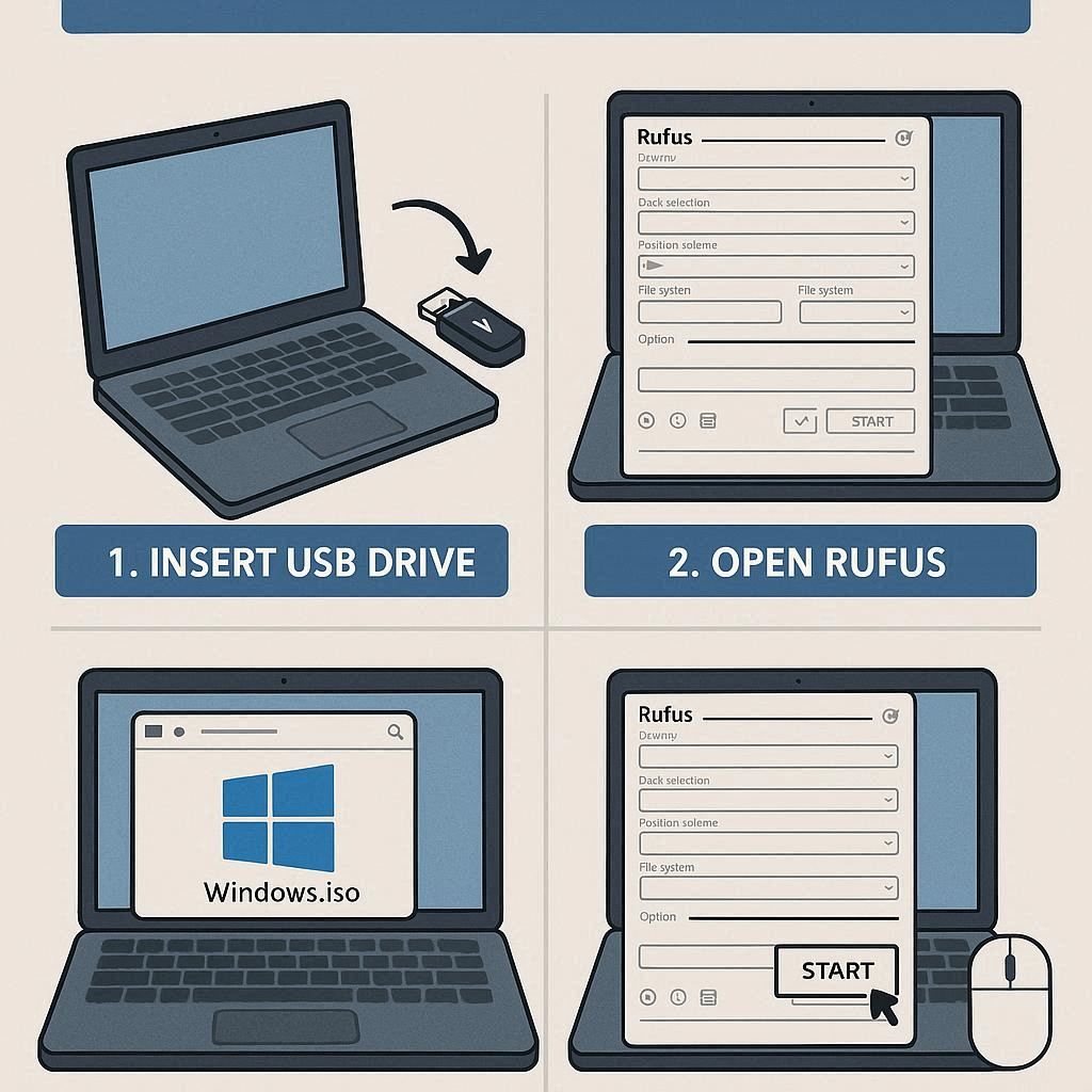 در مرحله عملی ساخت USB بوتیبل با Rufus، ابتدا فلش را در نرمافزار انتخاب کنید و فایل ISO ویندوز را بارگذاری نمایید. سپس Partition Scheme و Target System را متناسب با سیستم خود تنظیم کنید: GPT برای UEFI و MBR برای Legacy. گزینه Quick Format و File System پیشفرض معمولاً مناسب است، اما کاربران حرفهای میتوانند تنظیمات پیشرفته مانند Cluster Size را تغییر دهند تا عملکرد بهتر شود. با فشردن دکمه Start، فرآیند ساخت بوتیبل آغاز میشود و پس از چند دقیقه، USB آماده نصب ویندوز است. رعایت این مراحل باعث میشود نصب ویندوز بدون ارور، سریع و امن انجام شود و تجربهای حرفهای و مطمئن از آموزش نصب ویندوز با فلش بوتیبل برای کاربران ایجاد گردد. این روش پایهای استاندارد برای نصب ویندوز روی هر لپتاپ یا کامپیوتری محسوب میشود.
