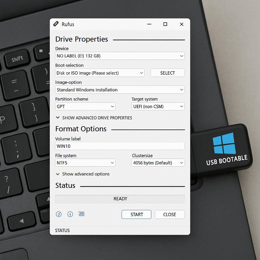 در مرحله عملی راهنمای ساخت فلش بوتیبل برای لپ تاپ و PC، ابتدا فلش را به سیستم متصل کرده و نرمافزار Rufus یا Media Creation Tool را اجرا کنید. سپس فایل ISO ویندوز را انتخاب و تنظیمات پارتیشن را با توجه به سیستم تعیین کنید: GPT برای سیستمهای UEFI و MBR برای Legacy. گزینههای Quick Format و File System پیشفرض معمولاً کافی هستند، اما کاربران حرفهای میتوانند تنظیمات پیشرفته مانند Cluster Size را تغییر دهند. با کلیک روی Start، فرآیند ساخت فلش بوتیبل آغاز میشود و پس از چند دقیقه، USB آماده نصب ویندوز است. رعایت دقیق این مراحل باعث میشود نصب ویندوز روی لپ تاپ و PC بدون خطا و با سرعت بالا انجام شود. این روش تجربهای امن و حرفهای از آموزش نصب ویندوز با فلش بوتیبل برای کاربران مبتدی و حرفهای فراهم میکند و فرآیند نصب را بهینه میسازد.
