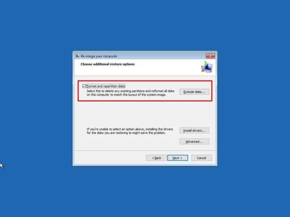 6. اگر یک نسخه پشتیبان کامل را در رایانه خود بازیابی می کنید یا هارد دیسک را جایگزین می کنید، گزینه Format and repartition disk را انتخاب کنید.