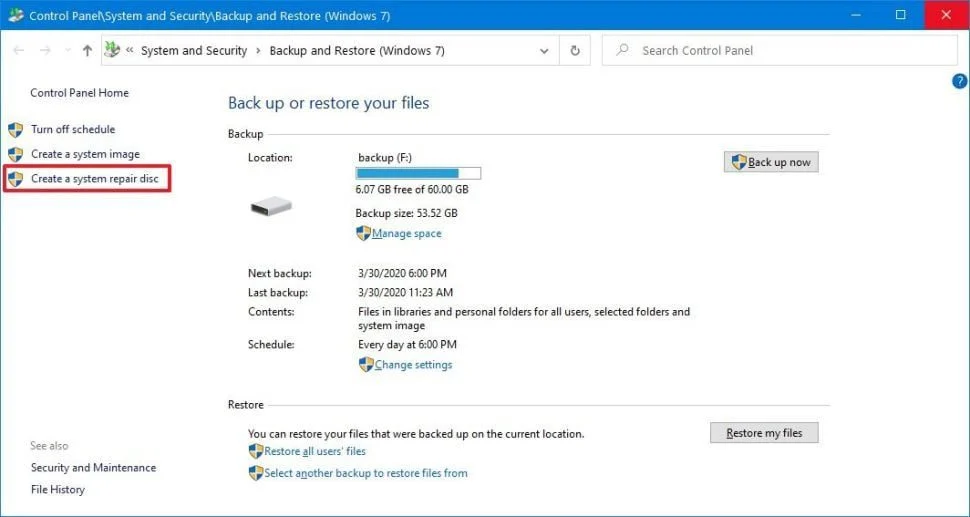 - از قسمت سمت چپ روی گزینه Create a system repair disc کلیک کنید.