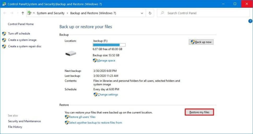 - در قسمت « Looking for an older backup»، روی گزینه Go to Backup and Restore و در قسمت «Recovery»، روی دکمه Restore my files کلیک کنید.