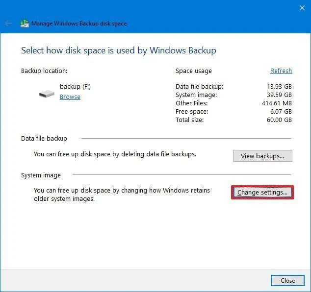 - در بخش « System image»، روی دکمه تغییر تنظیمات کلیک کنید.