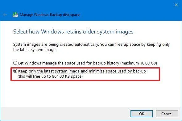 11. گزینه Keep only the latest system image and minimize space used by backup را انتخاب کنید و روی دکمه OK کلیک کنید.