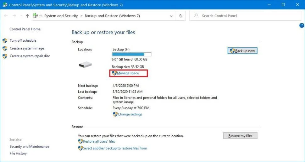 یکی از مزایای مهم این است که برخلاف گزینه خودکار، همیشه می توانید درایو پشتیبان را جدا کرده و آن را در مکانی امن ذخیره کنید، که می تواند از داده های شما در برابر بدافزارها و هکرها و همچنین در برابر بلایای طبیعی محافظت کند. شبیه به فرآیند خودکار، پشتیبانگیری از تصویر سیستم نیز چند اخطار دارد. فقط از آخرین باری که این ویژگی را اجرا کردید میتوانید فایلها را بازیابی کنید. در نتیجه، اگر در ایجاد پشتیبان گیری فعال نباشید، ممکن است در طول فرآیند بازیابی اطلاعات زیادی را از دست بدهید. همچنین، این ویژگی برای بازیابی کل سیستم شما است، نه فایل های فردی.
