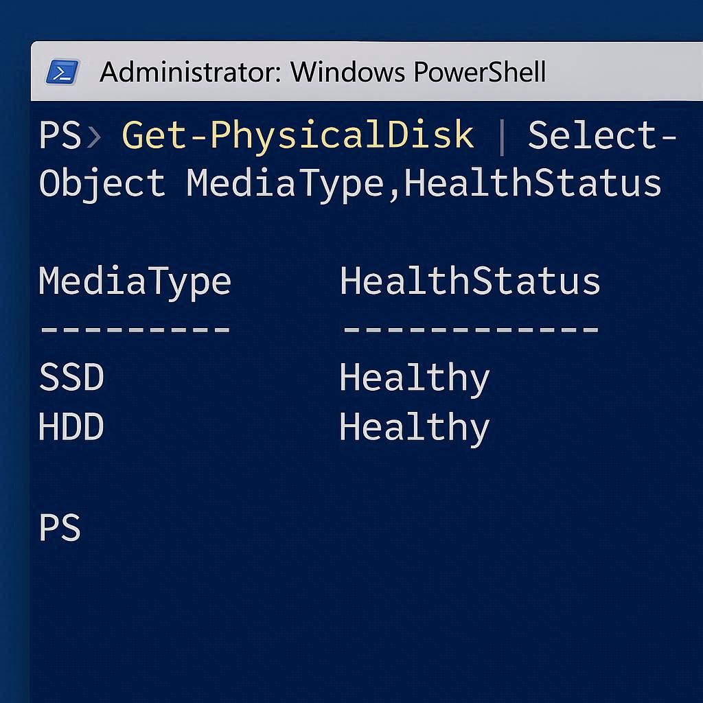 با اجرای دستور Get-PhysicalDisk یا دستورات مشابه، نوع دیسک (SSD یا HDD) نمایش داده میشود.